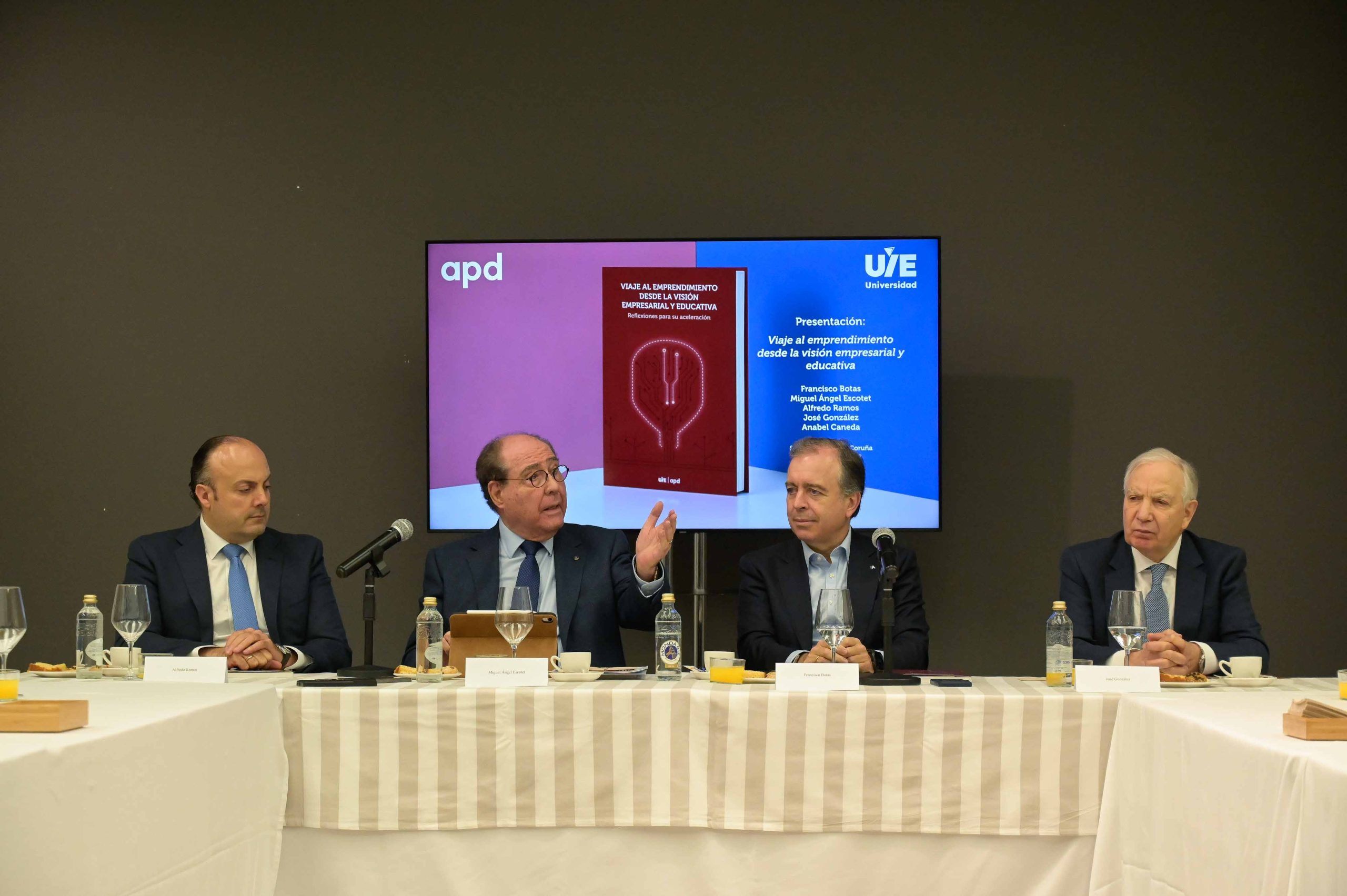Viaje al emprendimiento desde las visiones empresarial y educativa consta de cuatro capítulos desarrollados por un equipo profesional y académico que acredita una amplia experiencia en los ámbitos tanto de la propia práctica emprendedora como en la gestión empresarial, la investigación, la innovación, la educación, la psicología social, la cooperación internacional y el tercer sector. En palabras de Miguel Ángel Escotet «El hecho de crear una empresa va indiscutiblemente aparejado a transformar ideas en realidades tangibles, capaces de dinamizar la economía y promover el bienestar social. Este estudio tiene la misión de proporcionar mecanismos de apoyo que acompañen al emprendedor, faciliten su progreso y le ayuden a superar las dificultades propias del proceso emprendedor». Asimismo, remarcó «la colaboración consolidada entre APD Noroeste y la UIE, que mira al futuro y que contribuirá a ofrecer una visión fértil sobre cualquier temática de interés para el progreso social actual, pues la universidad y la empresa hacen un tándem perfecto a la hora de afrontar los desafíos empresariales, de innovación y de desarrollo social de nuestro tiempo».